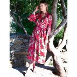 Dieser feminine Kimono Haus-Mantel hat einen floralen Druck in Grün- und Rosatönen auf fuchsia-farbenem Hintergrund. Das Material hat einen leichten Glanz und einen kühlen Griff. Mit dem außergewöhnlichen Druck und dem hautangenehmen Material ist dieser Morgenmantel vielfältig kombinierbar als Haus- oder Morgenmantel für die wärmere Jahreszeit.
