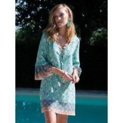 Diese sommerliche Tunika hat einen ausgefallenen Druck in apricot und grün mit floralem Muster auf türkisblauem Grund. Der Saum unten ist auf beiden Seiten geschlitzt. Diese elegante Tunika ist perfekt für den Sommer geeignet. Sie ist ungefüttert und kann daher als Sommerkleid, Strandkleid oder auch als Nachtwäsche und gemütliche Loungewear getragen werden. Außerdem passt sie perfekt zur Bademode von Chiara Fiorini.