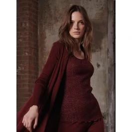 Das Grundmaterial dieser Wäsche Serie ist ein gerippter, rundgestrickter Ripp-Jersey in schwarz oder bordeaux-rot. Das Material ist hautsympathisch und angenehm zu tragen. Wolle-Seide wirkt temperaturausgleichend, knittert nicht und trocknet schnell. Sie wärmt im Winter und ist ausgleichend in der Übergangszeit. Außerdem ist dieses edle Material leicht elastisch und passt sich daher gut der Körperkontur an. Da dieses Shirt aus einer rundgestrickten „Schlauchware“ gefertigt wird, ist es seitlich nahtlos.